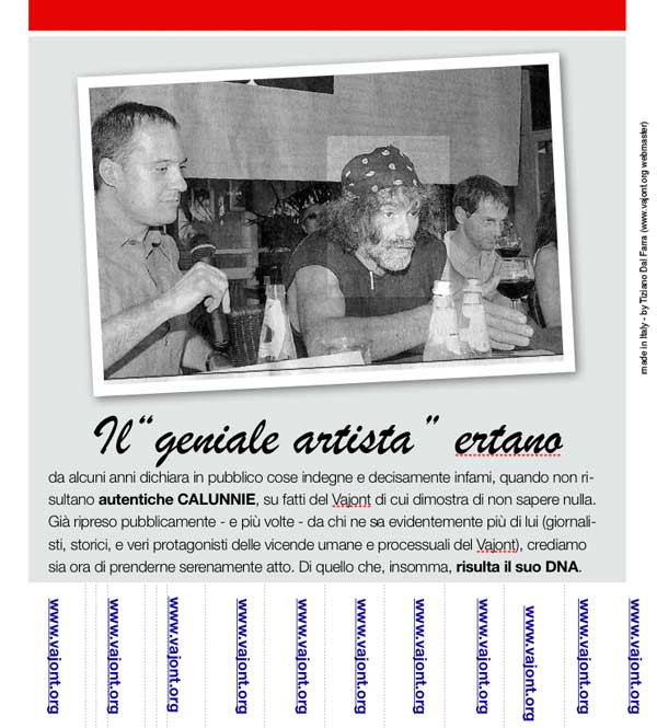Basta con le battute, per lasciare lo spazio alla tragedia di un paese scomparso. «Erto era un paese forte, allegro, poi c'è stato il Vajont e lo smembramento del paese in tre altri paesi, fra Belluno e Pordenone. A farne tre hanno potuto rubare molto di più che a farne uno solo ma dove è finita la comunità! Non esiste più, hanno diviso i fratelli, li hanno messi uno contro l'altro, si litigavano per chi doveva avere i soldi».