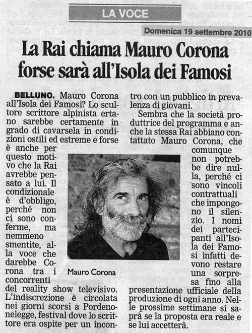 Noto dagli articoli, che tutti i mammasanta longaronesi e della Curia come da consuetudini han fatto obolo alla stampa di qualche parola struggente e caimana sull'accaduto. Mancano all'appello solo il commento dell'artista/delinquente/bracconiere pentito ma non del tutto Corona Maurizio detto "Mauro" (oggi valentissimo bracconiere di cervelli fritti, ad uso Mondadori) sui lati tecnici di strumenti, e sevaggia poesia, e tattiche, della caccia al cinghiale e alte dissertazioni di Borges (o Von Hoffmanstahl) nella medesima.