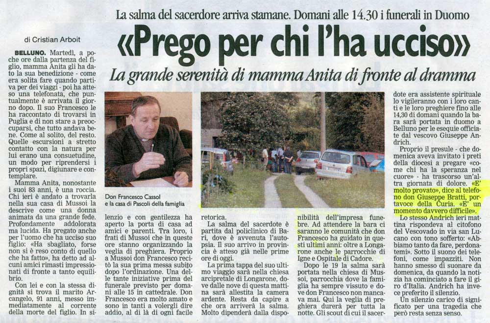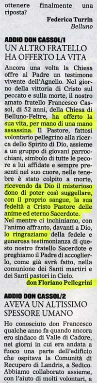 Ma sono tutti soggetti distanti anni luce e quant'altri mai dal ritratto che oggi emerge - sotto i profili caratteriale, e concreto - del povero don Francesco Cassol, un 'diverso' e quindi 'a rischio', insomma in qualche misura un 'cane sciolto' pericoloso perché indipendente, nella gelatino$a e babba Longarone dei suoi giorni.