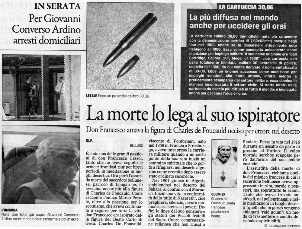 Ancora: tra 17/20 persone distese, il colpo"a caso" ha centrato proprio il parroco: anvedi che sfiga per Don Cassol. Qui non è molto chiaro: si dice/scrive che lo sparatore abbia poi "conversato con alcuni ragazzi" prima di fuggire. Altri ancora scrivono che alcuni ex dormienti "han sentito il rumore del proiettile" e hanno cominciato a parlarsi, facendomi capire/pensare che non si sia udito/distinto uno sparo. Possibile, quando la carabina (di un killer, o di un bracconiere prudente e accorto) fosse munita di silenziatore, segno a sua volta di un raziocinio che confligge frontalmente col resto. A trenta metri, lo sparo di una carabina da caccia grossa nella loro direzione, li avrebbe svegliati tutti di BOTTO assordati e terrificati, e avrebbe prodotto un lungo eco nella notte. Chi ha assistito - come lo scrivente - alle prove tecniche dei cacciatori di camosci/cervi in poligono sa cosa intendo. E sa anche che quelle carabine non lasciano alcuna possibilità al selvatico: prima gli arriva la pallottola che lo stecchisce, e "poi" lo sparo. La grossa pallottola all'impatto a bersaglio - anche in poligono - fa lo schiocco netto di una scudisciata. Don Cassol per i suoi ultimi tre/quattro minuti non dev'essere stato proprio muto.