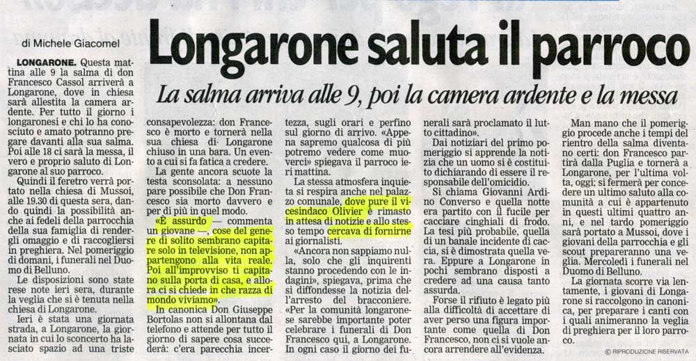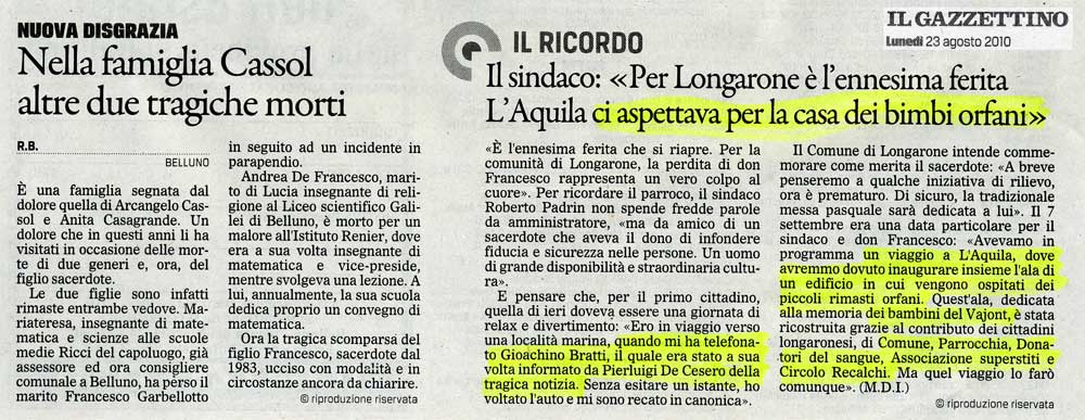 Tutta questa $toria, è un 'giallo'. Di ba$$i$$ima lega, da $uburra, non PERCEPITO come tale. Ma tant'è, dal '64, in Longarone e attorno. Povero Don Cassol, povera la famiglia, più poveri NOI. Una volta di più un "destino $egnato".