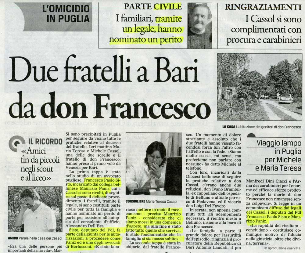 La famiglia Cassol pregherà con fervore attendendo Giustizia (che non verrà, o non certo come la intendono loro) e l'a$tuto Paniz dalla sua posizione privilegiata (per soldi, TV e pubblicità grati$ e preziosa in OGNI caso) si è ben piazzato nel baricentro delle cose. Come addetto ai lavori incaricato & titolare avrà sott'occhio, costantemente, tutte le prove/indizi e quant'altro gli possa servire a tenere gli "investigatori pugliesi" a casa loro, LONTANI e a$$olutamente dimentichi di Longarone e della vita privata e pubblica della vittima/suo cliente/fiore all'occhiello: il caso è chiuso. Peccato, dico io: chiuso prima ancora di cominciare. Ma $uccede.