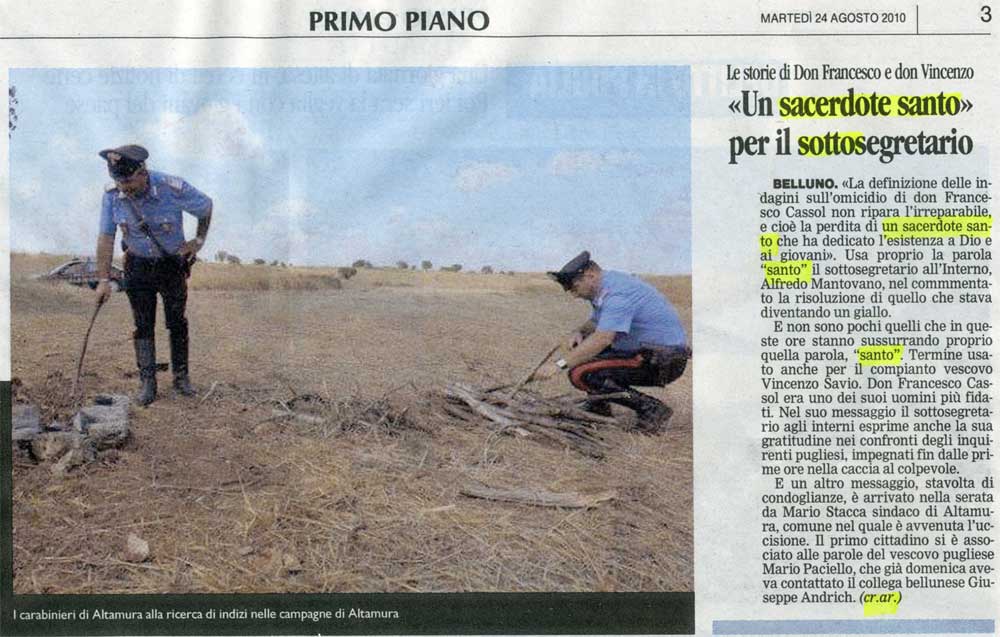 Ma tutta questa storia diventerà anche una tacca in più per i Paniz; una ricorrenza lacrimogena in più per chi ci crede; e assenzio per gli utenti-utonti delle stampe locali, e forse balsamo per la famiglia Cassol (ora la vera vittima sacrificale e consenziente quanto inconsapevole, e manipolata, e fonte di lucri infiniti); una coccarda in più da esibire per la (stra-ricca) Curia bellunese dopo un top-Hit come Albino Luciani, a Suo tempo altro precoce martire chiamato a più alti Impegni direttamente dallo $pirito $anto. E tutti contenti, insomma.