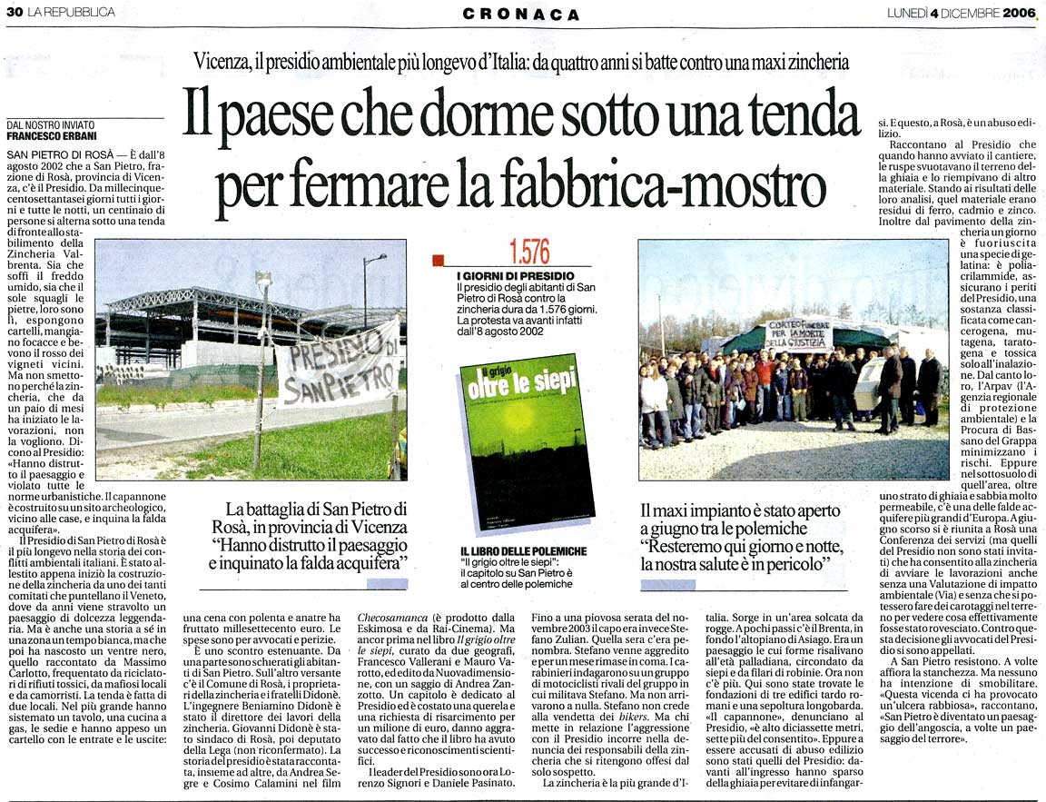 Una storia pluriennale di MAFIA COMUNALE, peggio di quella di Longarone, se possibile, a pochi chilometri da Bassano (NORD ITALIA). Compreso un tentato omicidio. Leggi qui del "Presidio S. Pietro". Un intero paese si ribella all'inquinamento cancerogeno ed agli abusi edilizi sull'ambiente. Anche le leggi sembrano "fermarsi" (come a Longarone), per la "gente normale", quella che "non vale nulla".