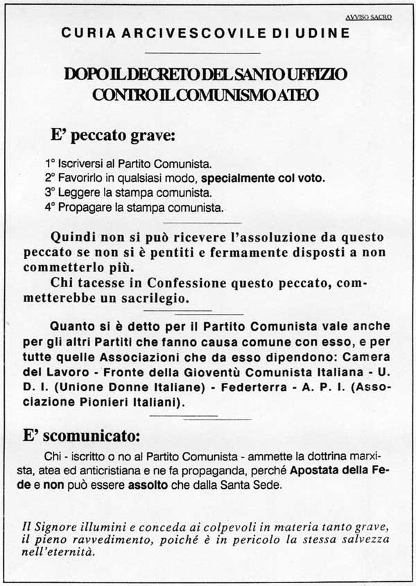 18 marzo. C'entra relativamente poco col "Vajont" in sé, ma c'entra moltissimo col clima in cui le denunce della Merlin dovevano farsi strada su di un foglio che era anche "organo di partito del PCI" . Un documento originale del febbraio 1948 che anticipa di poco le prime "elezioni" politiche di quell'anno in cui votarono per la prima volta in Italia (ed ecco il problema da esorcizzare) anche le DONNE. Il documento all'epoca edito dalla Curia di Udine, è singolarmente attuale secondo me ANCHE rispetto all'attuale diatriba sui "DICO". Dovrebbe notarsi - come da quegli anni ad oggi, le pressioni ecclesiastiche sulla credulità popolare - occorre ricordare il diffuso analfabetismo del tempo, scolastico ma non solo - e negli affari politici italiani (grazie a un agreement fascista), non siano mai venute meno, mascherate da "attaccamento a dei valori". E che "valori" (cristo!).... Leggi qui l'Avviso Sacro Permanente.