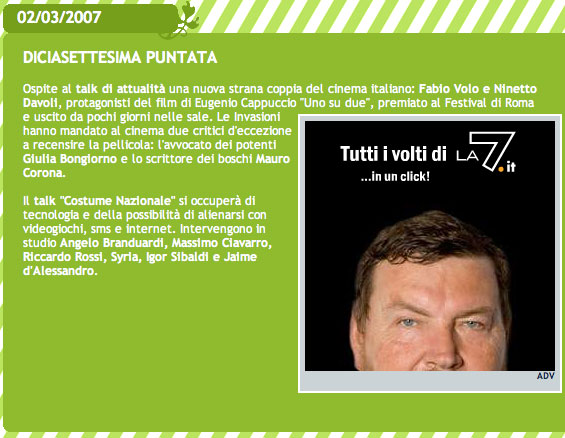 GIOVEDI' 1 Marzo. FIND YOUR SPIRIT ...(= in inglese, "Fronteggia il tuo alcool"). Stasera da Piero Chiambretti, al dopo-festival di Sanremo, il patetico Fenomeno ertano si esibirà in uno dei suoi blitz/spot alcolemici in cui parla e parla cercando qualcosa da dire, ma non ho ben capito se registrato, o in diretta. Lo ha anticipato l'intere$$ato in per$ona alle 17.00 circa, in mia presenza, nella pizzeria di Erto.