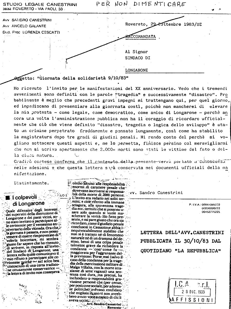 [ Sindaco dal 30.01.1981 al 11.06.1985 ] ] Durante la sua amministrazione - e in corso del finale di "Processo Vajont" - l'Avv. Sandro Canestrini rileva amaramente la mafiosità intrinseca di questo Comune e la sua apparente impossibilità a chiamare le cose col loro NOME, o anche solo a PUBBLICARE determinate prese di posizione pubbliche ('rosse', e perciò di "Sciacalli"??).