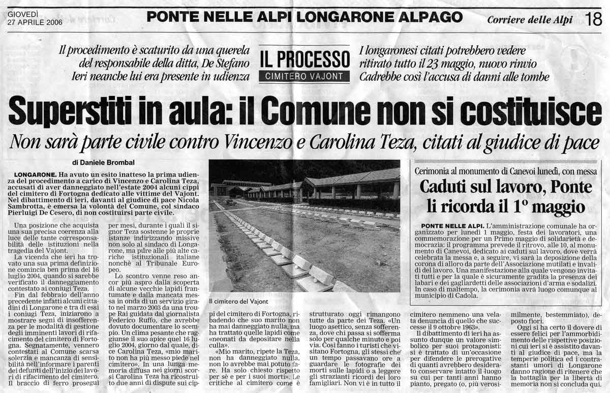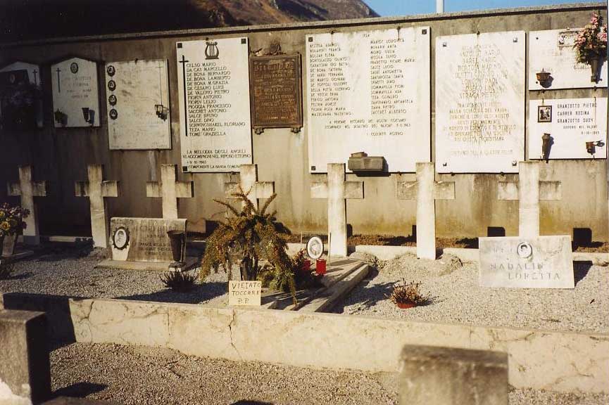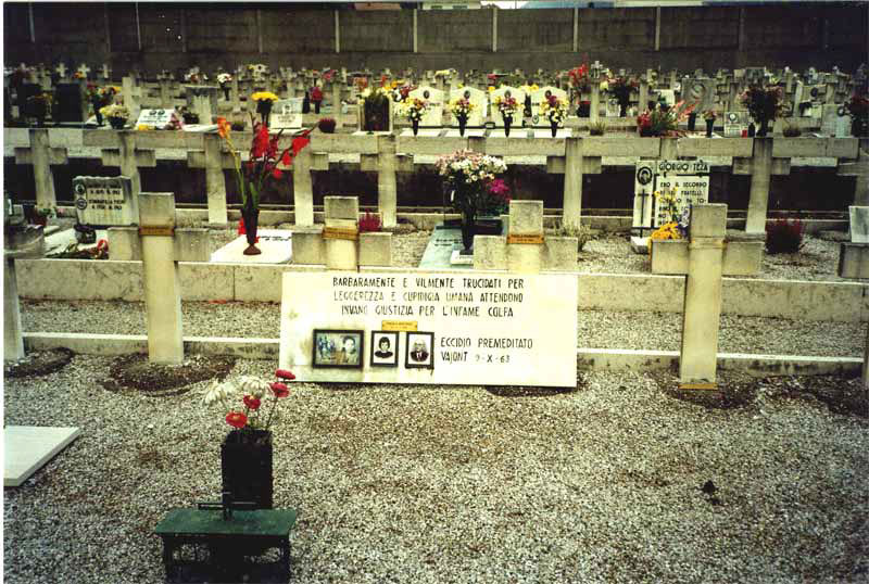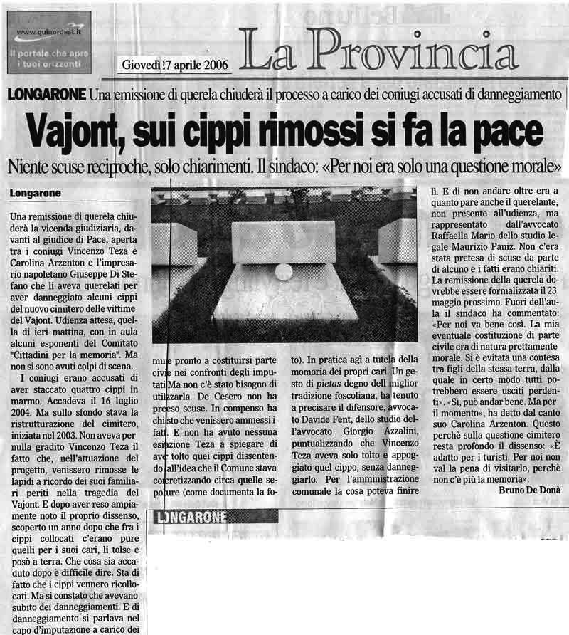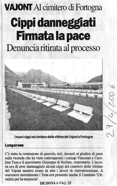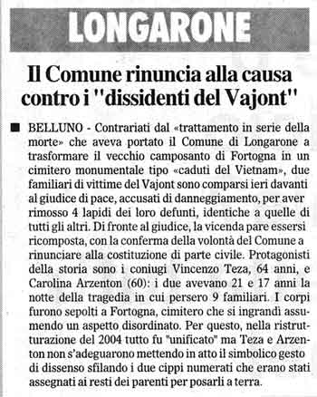 «Longarone fa la pace con due vittime del Vajont - Il Comune di Longarone ha rinunciato a costituirsi parte civile di fronte a due dei familiari delle vittime del Vajont. I due non avevano apprezzato la ristrutturazione del cimitero dove tutte le vittime erano state sepolte con identici monumenti funebri, e avevano sfilato i cippi assegnati ai loro parenti. L'azienda costruttrice querelò i due anziani, e il Comune si costituì parte civile. Ma ieri ci ha ripensato.»