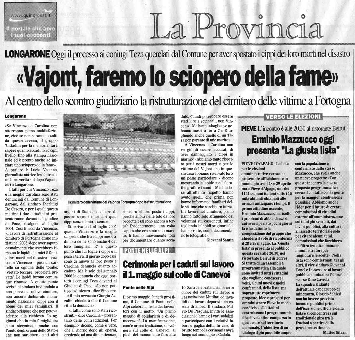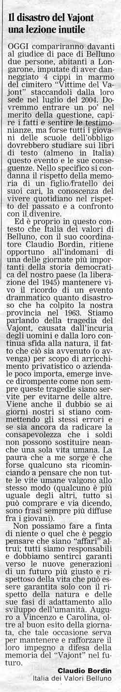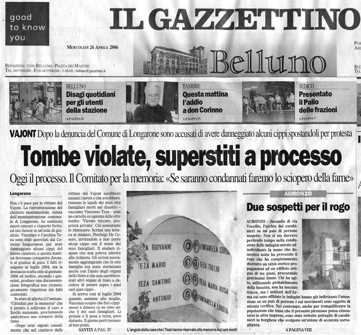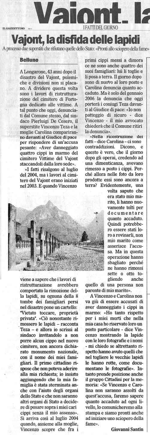 «Longarone fa la pace con due vittime del Vajont - Il Comune di Longarone ha rinunciato a costituirsi parte civile di fronte a due dei familiari delle vittime del Vajont. I due non avevano apprezzato la ristrutturazione del cimitero dove tutte le vittime erano state sepolte con identici monumenti funebri, e avevano sfilato i cippi assegnati ai loro parenti. L'azienda costruttrice querelò i due anziani, e il Comune si costituì parte civile. Ma ieri ci ha ripensato.»