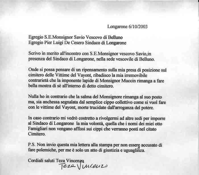 Vincenzo scrive una lettera al Presidente della Repubblica, al sindaco di Longarone, alla procura, al Presidente del Consiglio, al Tribunale Europeo ed alla stampa per manifestare civilmente il suo sdegno e il suo impegno civile, come cittadino italiano e superstite, perché la memoria e il rispetto delle vittime non venga nuovamente infangata e utilizzata a fini politici o spettacolari.